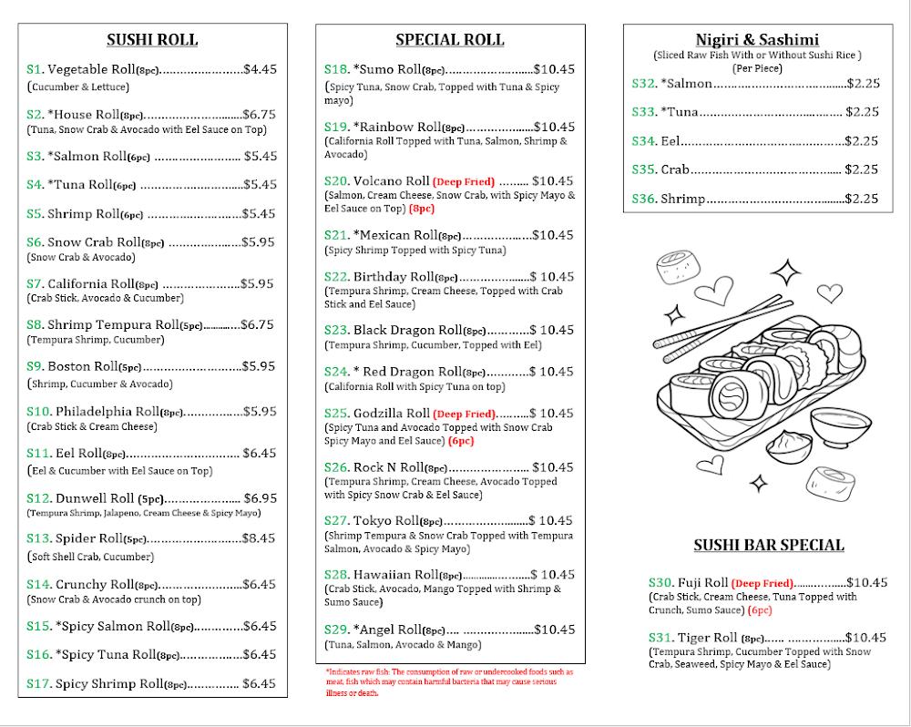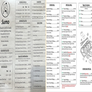 Sumo's menu showcases a wide variety of sushi rolls, express plates, and traditional Japanese options. Specialty rolls, averaging around $13.95, feature options like the Tiger and Hawaiian Rolls. Express bowls, starting at $9.55, appeal to customers looking for a quick, satisfying meal, with chicken and shrimp being popular choices.