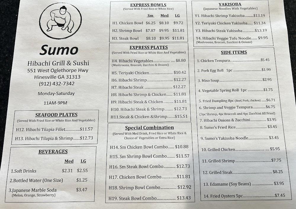 Welcome to SUMO, your go-to destination for authentic Japanese cuisine in Hinesville, GA. Located at 551 W Oglethorpe Hwy, we offer a diverse menu that features traditional dishes, including sushi and hibachi, all in a relaxed and trendy environment. Catering to vegetarians and families alike, our restaurant is perfect for lunch, dinner, or a solo bite. Enjoy the convenience of in-house dining, takeout, and delivery. Our accessible facilities ensure everyone can enjoy a meal at SUMO. Open for reservations, we accept credit and debit cards for seamless transactions. Come savor the flavors of Japan today!